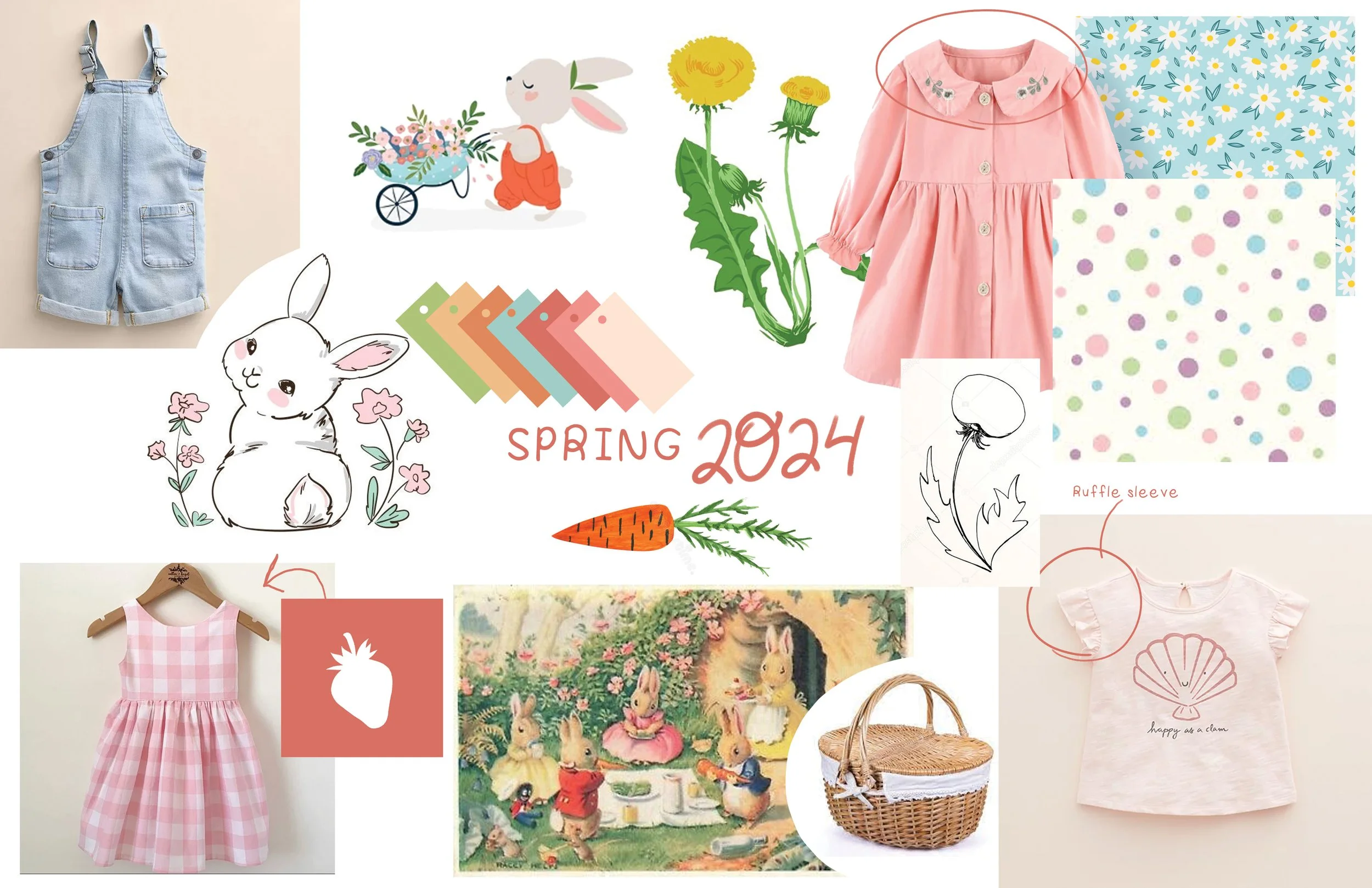 For this class project, I designed six clothing illustration designs for the spring 2024 Little Co brand at Kohl’s. In researching girl’s spring/summer clothing, there are always three things that are repeated throughout: animals, fruit, and flowers.